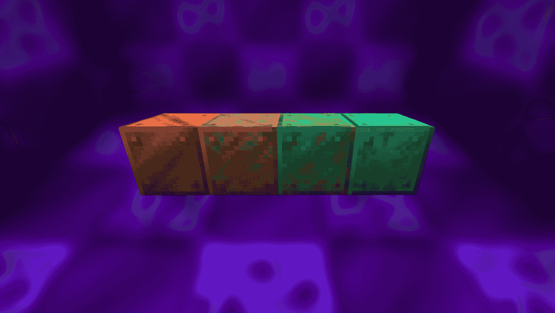 When placed in the world, copper blocks oxidize over time, changing color through four stages. They start reddish-brown and slowly turn green (the green patina) as they reach the final oxidation stages. This aging process is random and can take from a few hours to a few days of in-game time.